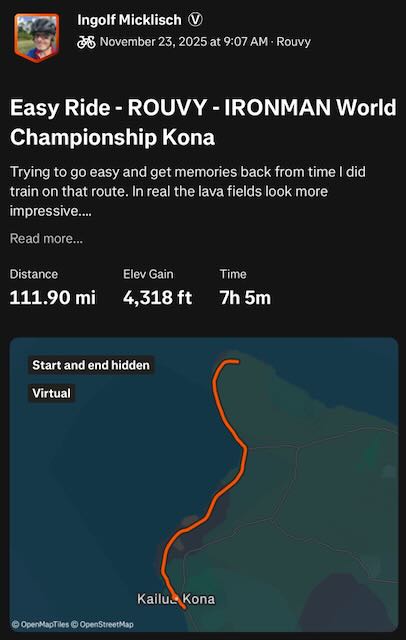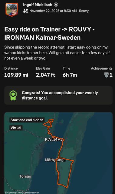 I know some might mainly look at my cycling activities and I try keeping them up somehow decent. Simply enjoy the hobby a lot. This year I noticed that I got a bit sloppy on other activities that do support my cycling performance. Last 2 years I always had some weight training, stretching/yoga and barefoot walking and running included in my regular procedures. Sadly sometime earlier this year I stopped the walking and running part. OK running is a bit borderline for me due to fear that I may cause some issues (had a major stress fracture in my left leg a few years ago that caused me to almost loosing my leg ... so I am nervous about that). Nevertheless I noticed the negative effects for not doing the regular barefoot walking. That made me pick up slowly barefoot walking a few weeks ago and I try keeping it in my mix of activities almost daily. Cool thing ... specifically last weekends on my endurance training rides I start notice the great effects on my feet again and happy I am back into it. It should help me on the last activities this year and be great preparation for my goals in 2026. Ohhhh ... even I dropped the running ... I am considering to mix in 1-2 mile running barefoot latest in December. With that I may do a 5k race again early 2026 ... just to proof to myself that its doable 🙂 Stretching and some minor weight training better stay in my routine weekly as well. Hardly record those at the moment but enjoy those as well. Its normally after my other activities.